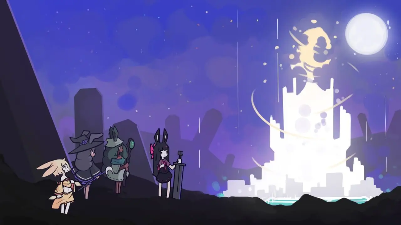 Start a run, pick a class, invite friends to your lobby and you're raiding in seconds. Anywhere from 1 to 4 rabbits can embark together. If you venture out alone, mechanics that normally require cooperation will be replaced with intense bullet hell attacks. Of course, it isn't always as simple as slapping down the enemies that stand in your way. Building your character with loot and upgrades you find along the way is key to success. Certain sets of items combo very well together... so make sure your allies don't roll on something you really need! A few months ago, all contact with the Moonlit Kingdom was lost. Reports indicate that the city's denizens attack outsiders on sight. Investigative expeditions are repelled or go missing. A colossal white tower now manifests in the city's center each night, stretching skyward towards the stars.Something must be done. The rabbits will take care of this. The night is short. Move swiftly.